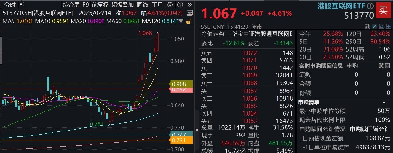 重仓港股互联网龙头的港股互联网ETF(513770)早盘低开后单边向上,场内价格收涨4.61%,续刷2022年2月18日上市以来新高,全天成交额10.72亿元,连续3日环比放量。